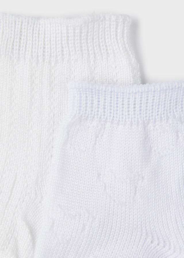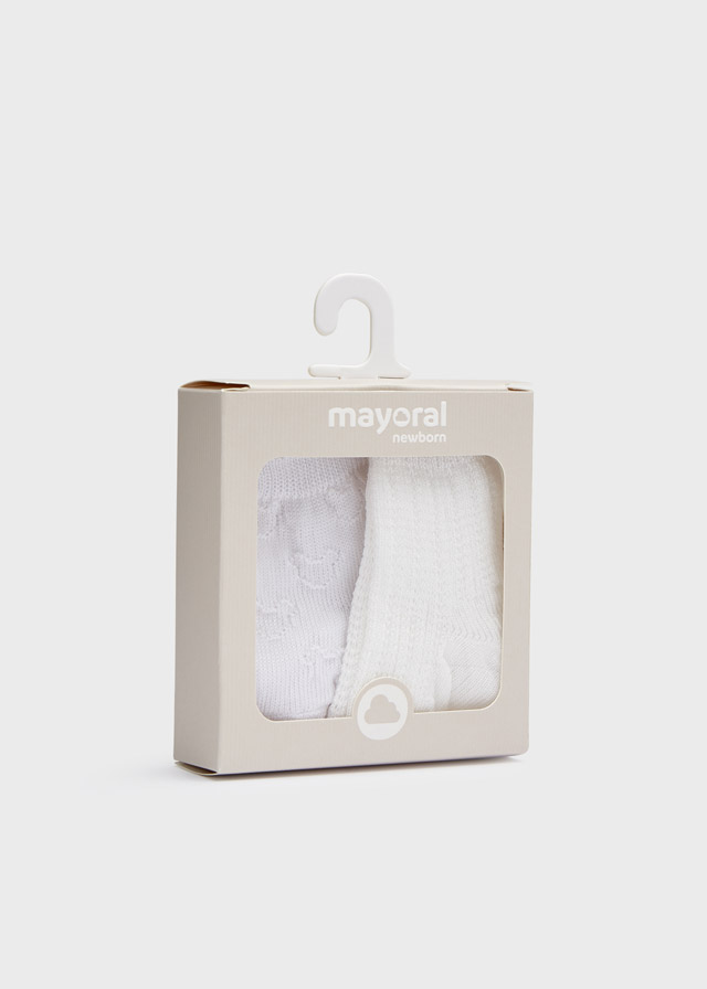 Set de dos pares de calcetines elaborados en hilo perle, para recién nacido, con detalle calado en tono blanco. Es de la colección primavera verano de NewBorn (Mayoral),