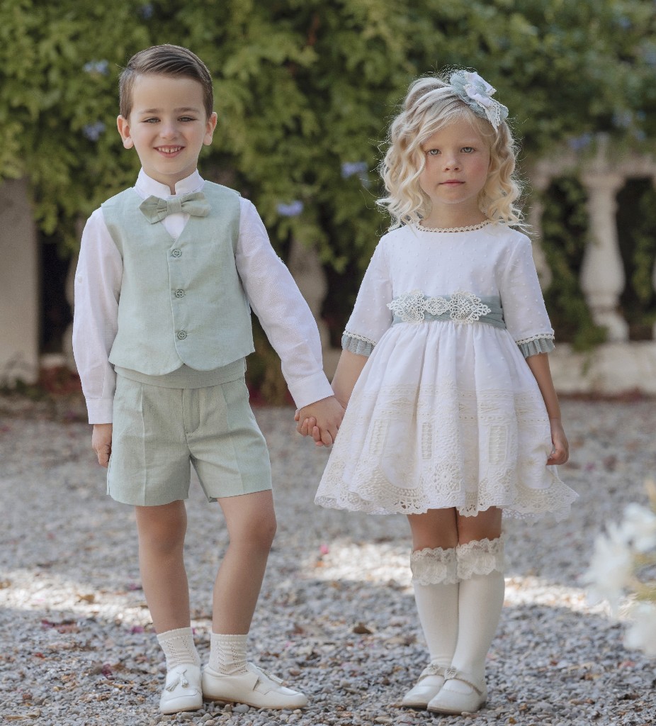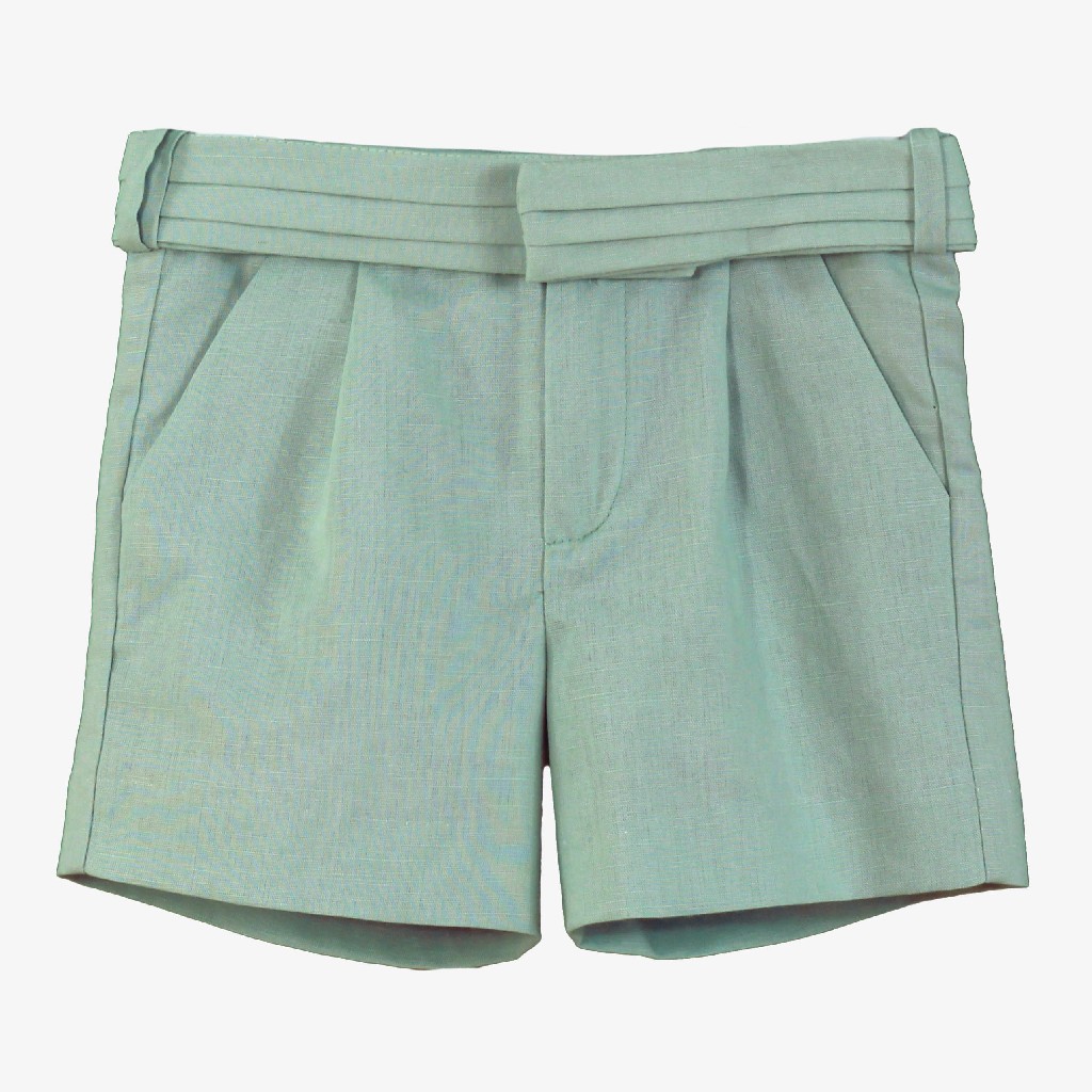 Elegante Pantalón Corto Infantil de ceremonia, elaborado en tela de lino, en tono Verde Agua. Su corte tipo chino lo hace ideal para esa próxima celebración.