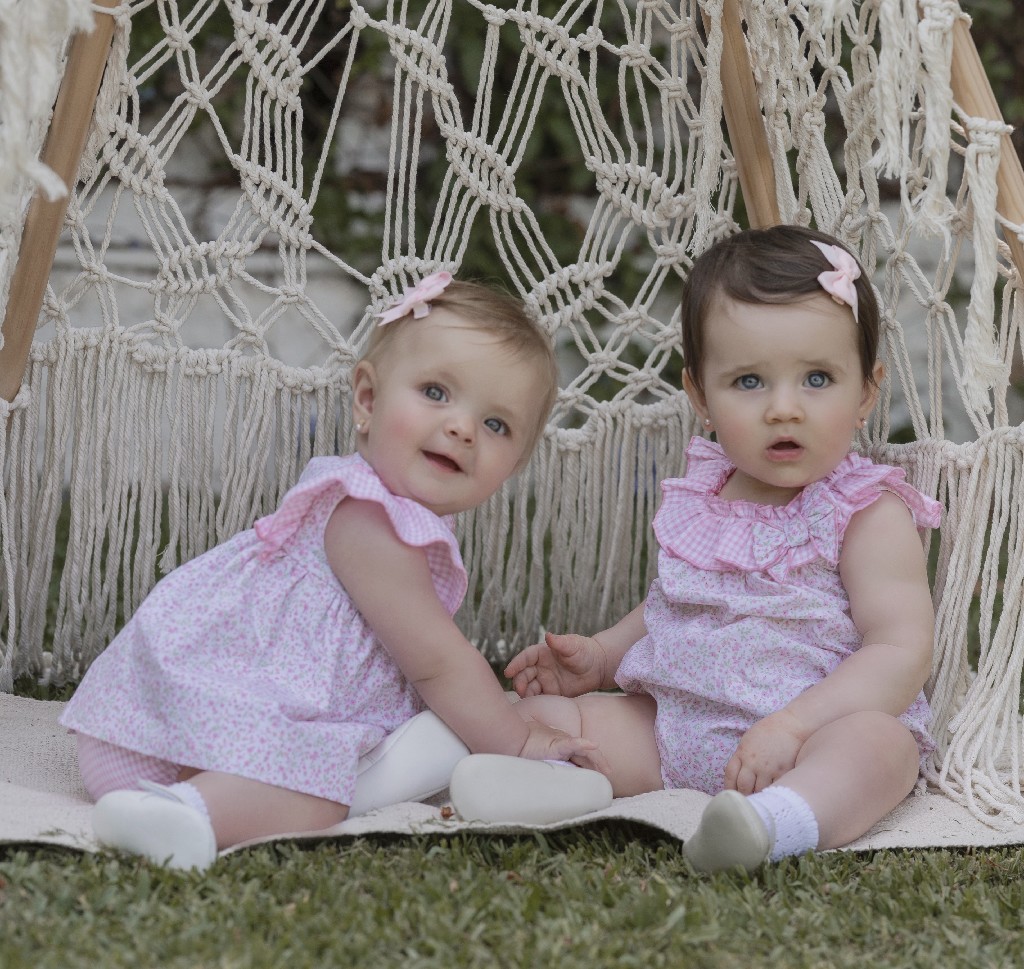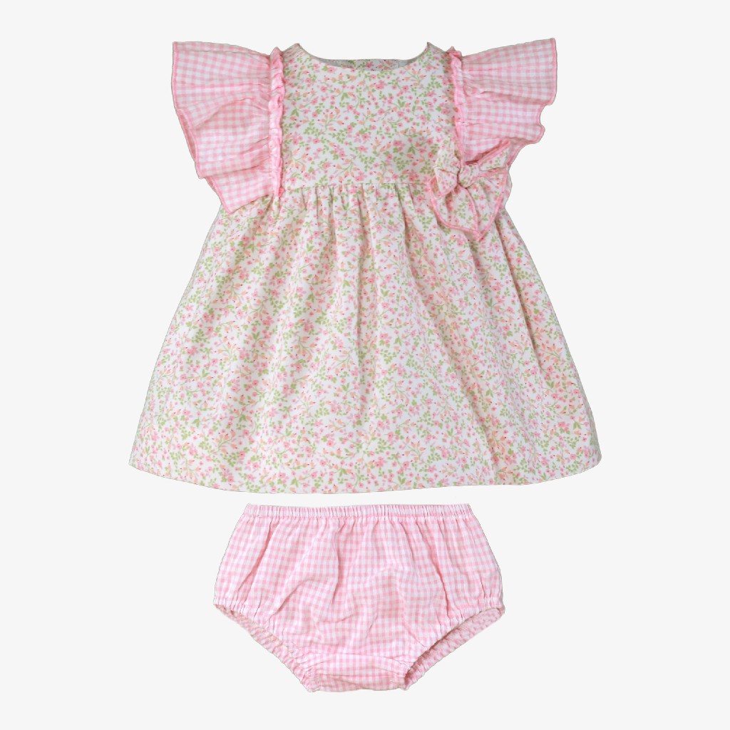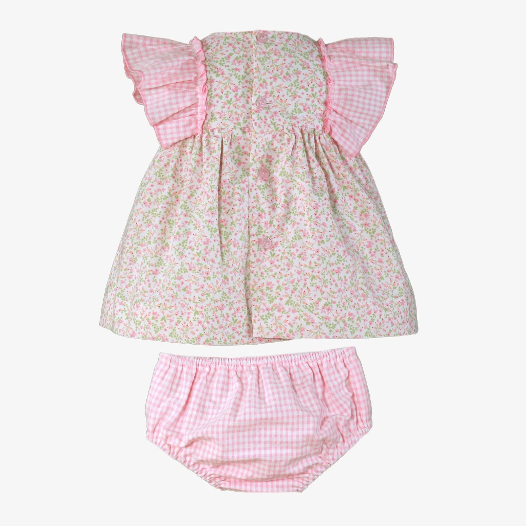 Bonito Vestido Estampado en color Rosa con detalle de volantes de cuadro vichi en mangas. Incluye Braguita con el mismo cuadro